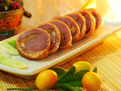 金棗鴨肉卷是鴨賞達人王錫傳先生,把金棗本身酸酸甜甜的柑橘香味,融入原有鴨肉捲的香味,讓鴨肉捲的香味再往上提升,吃起來肉質滑嫩有嚼勁,還有清淡的金棗特有的酸甜柑橘味,吃多也不會油膩,可稱是宜蘭特產的新美食。